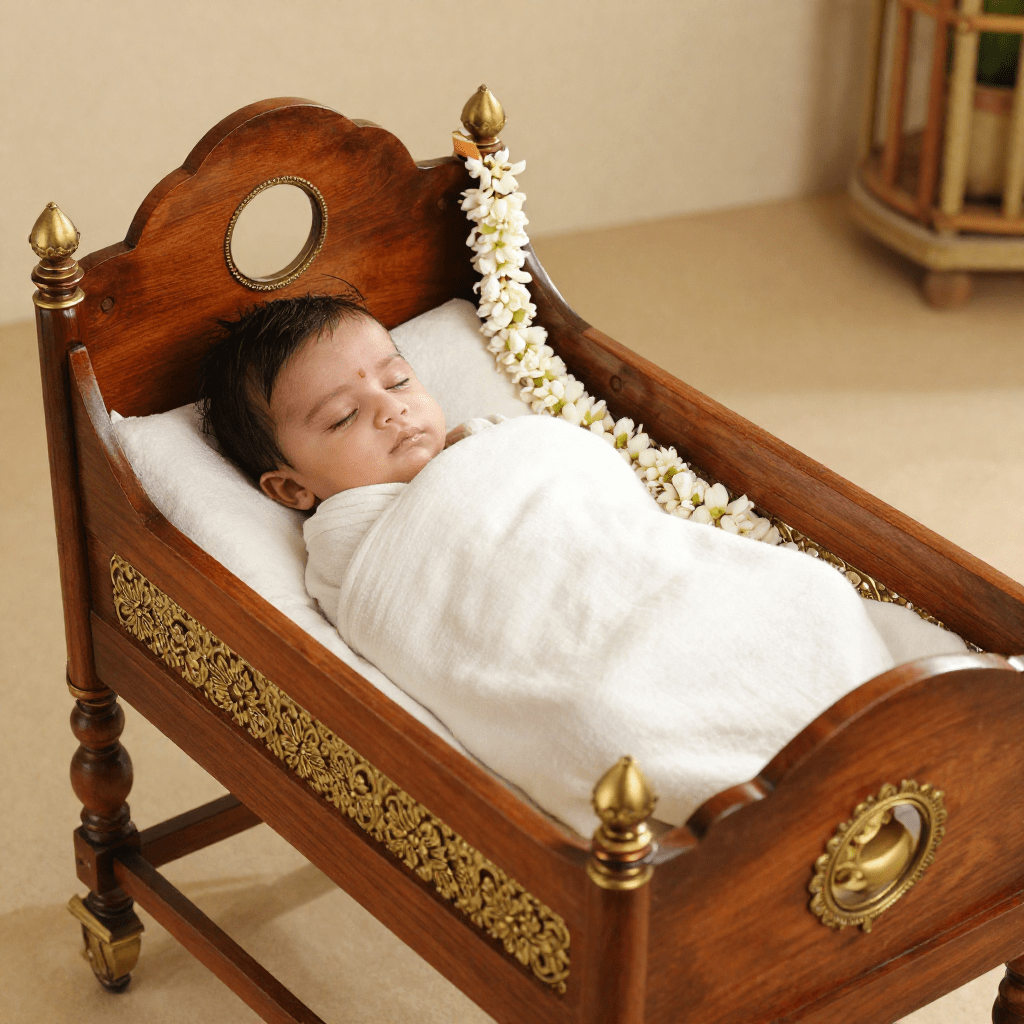 The Joola Ceremony (Cradle Ceremony) is a beautiful and emotional ritual performed for a newborn baby in many Sri Vaishnava / Iyengar families. In this ceremony, the baby is formally placed in a decorated cradle for the first time while family members sing traditional cradle songs and bless the child.