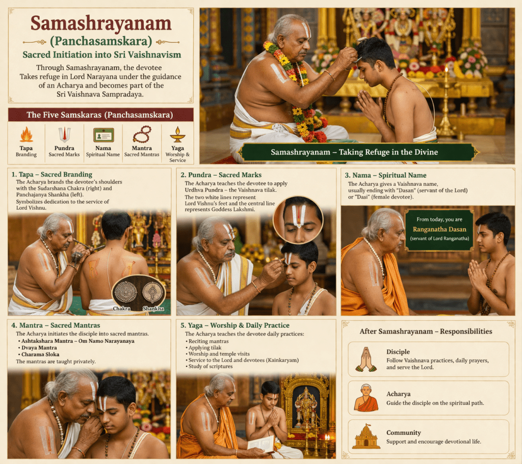 Samashrayanam is the sacred initiation ceremony through which a devotee formally becomes a follower of the Sri Vaishnava tradition.